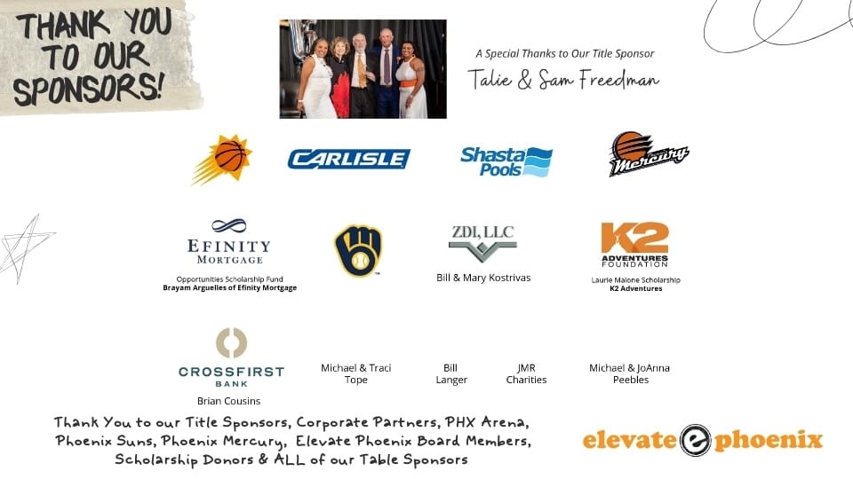 The impressive list of sponsors underscored the community’s commitment to Elevate Phoenix’s mission. Title Sponsors Talie & Sam Freedman, alongside Corporate Partners PHX Arena, Phoenix Suns, Phoenix Mercury, and the dedicated Elevate Phoenix Board Members, demonstrated their unwavering support. The generosity of Scholarship Donors and Table Sponsors was also deeply appreciated, forming the backbone of an event that directly impacts the lives of deserving students.